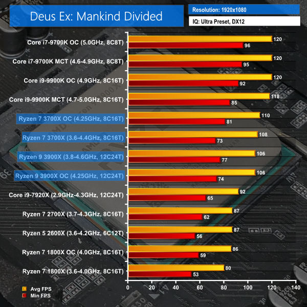 Deus Ex: Mankind Divided gives us an early indication of AMD’s Zen 2 gaming performance. Running at the high refresh rates permitted by the popular 1080P resolution and a Gigabyte Aorus RTX 2080 Ti graphics card, we see that Intel still rules the show when it comes to all-out gaming performance.