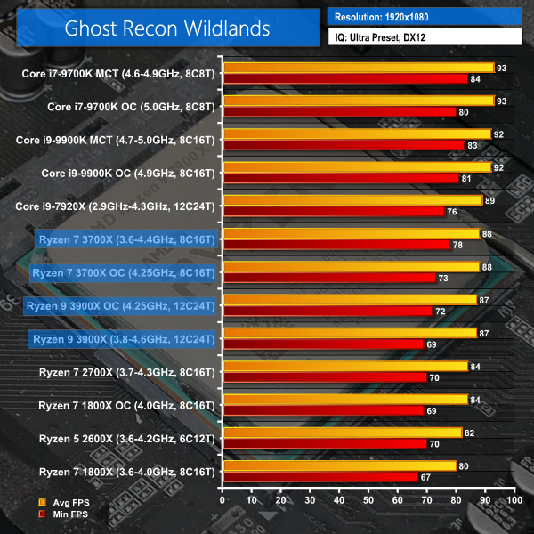 Ghost Recon Wildlands is demanding on the GPU when using its ultra preset, even at 1080P. As such, we see little performance difference between all CPUs on show. Intel’s Coffee Lake chips still sit firmly at the top of the chart, partnered by the HEDT 7920X, with around 5% higher performance than the Ryzen 3000 processors.