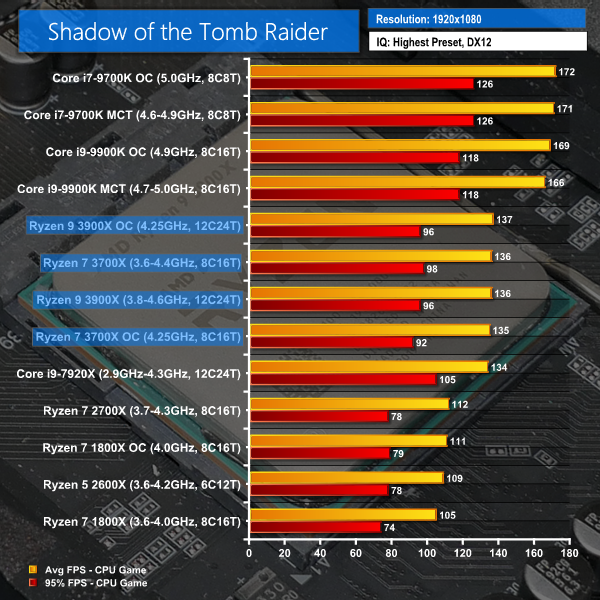 The trend continues. Intel’s Core i7-9700K and i9-9900K place at the top of the performance chart in Shadow of the Tomb Raider. With average FPS values around the 170 FPS-mark, this is pushing to the point where the results are beyond what most people would aim for.