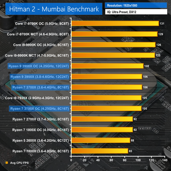 The performance increase from Zen and Zen+ to Zen 2 is less pronounced in Hitman 2 and, as such, the Ryzen 3000 performance deficit to Coffee Lake’s best sits around 15%. If you want to push past 120 FPS on average with a strong GPU such as our Aorus RTX 2080 Ti, Intel’s 9700K and 9900K are the best choices.