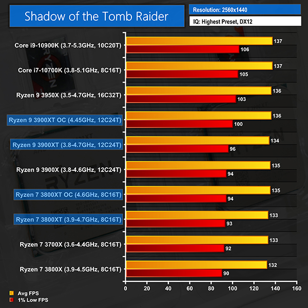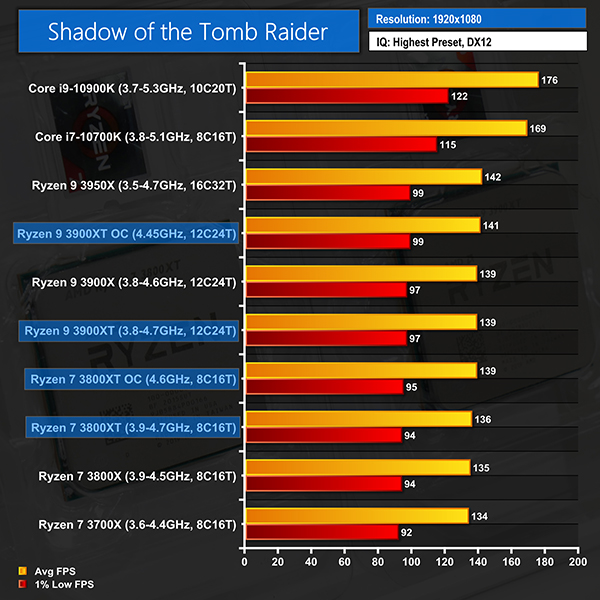 Shadow of the Tomb Raider tends to reward higher core counts with slightly higher frame rates. As such, we see the 3800XT’s better frequency than the other eight-core Zen 2 chips deliver slightly better performance but without matching the 3900XT.
