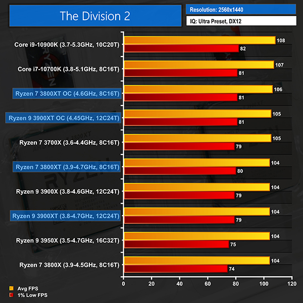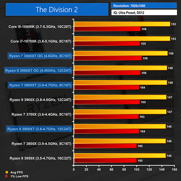 The Division 2 likes frequency, so the 3800XT and overclocked 3900XT both deliver very marginally higher frame rates at 1080P. Realistically, this is basically a performance tie between the stock-clocked Zen 2 chips, once again.