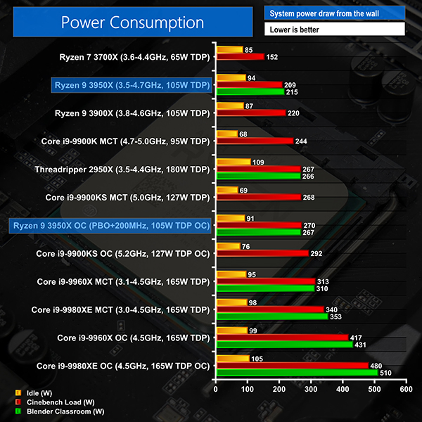As some quick points of comparison, Intel’s 16-core i9-9960X demands over 100W more power at stock, the Core i9-9900K is 35W hungrier, and the Threadripper 2950X guzzles almost 60W extra. None of those processors outperform the 3950X in the associated Cinebench R20 test.