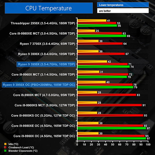 Temperature recordings were taken using a 240mm Corsair H100X all-in-one liquid cooler with two SP120L fans running at 2435 RPM. Ambient temperatures were around 24°C. We do not yet have full data for our new Blender Classroom reading for all comparison CPUs.