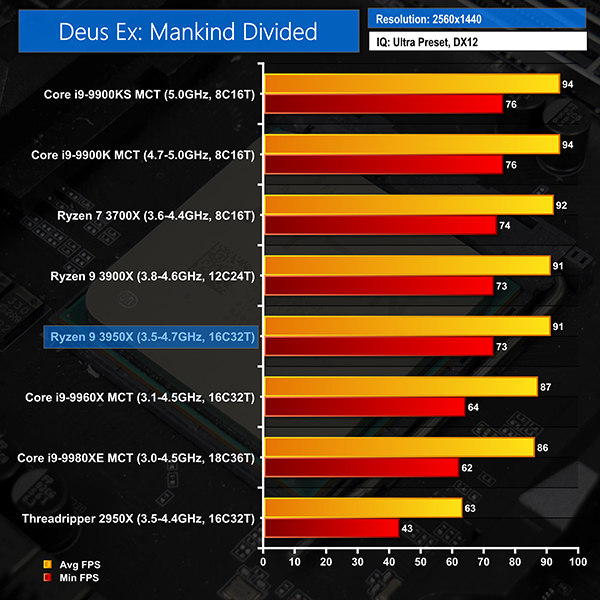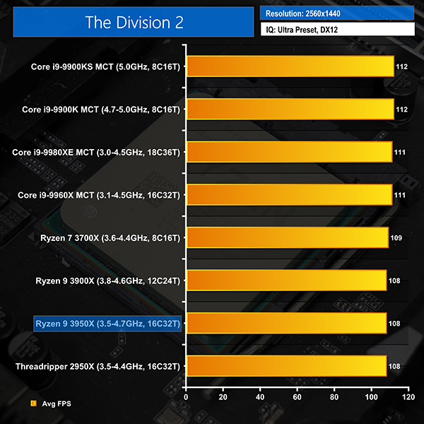We supplement the 1080p gaming results with three games tested at 2560×1440 resolution. We chose Deus Ex: Mankind Divided, Far Cry 5, and The Division 2. Deus Ex and The Division 2 are particularly GPU heavy at higher resolutions and Far Cry 5 is a (relatively) computationally-heavy, open-world game.