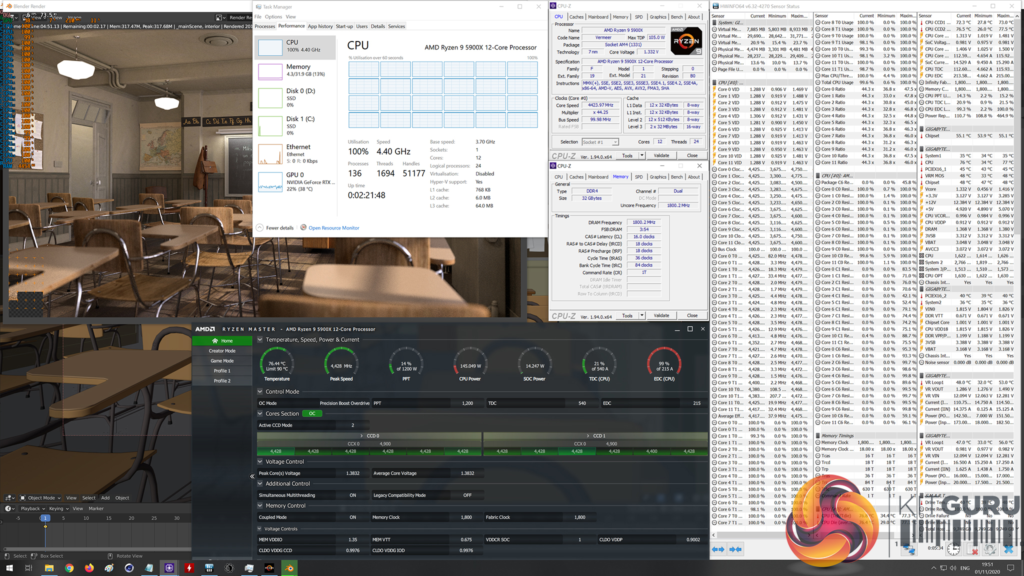 We see the 5900X running at around 4.3-4.4GHz under an all-core load situation in the likes of Cinebench R20 and Blender. This an impressive boost clock figure for the 12-core chip directly out of the box as it is around 300MHz faster than even the 3900XT 12-core processor.