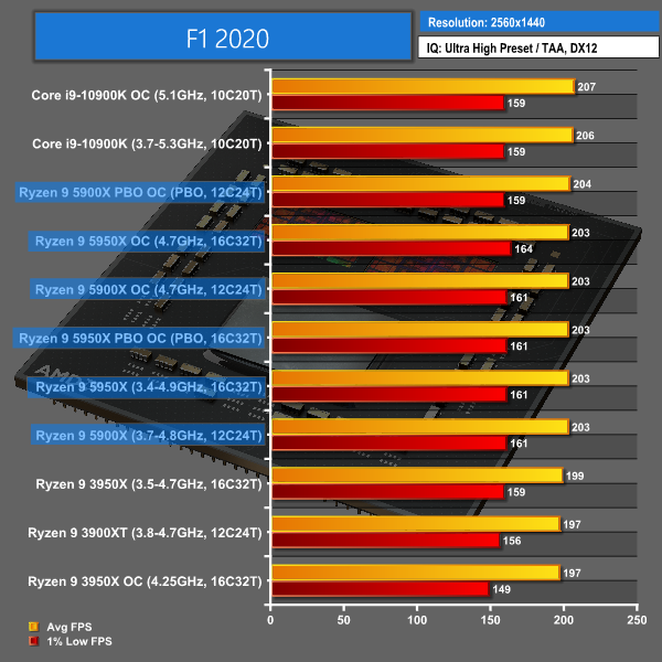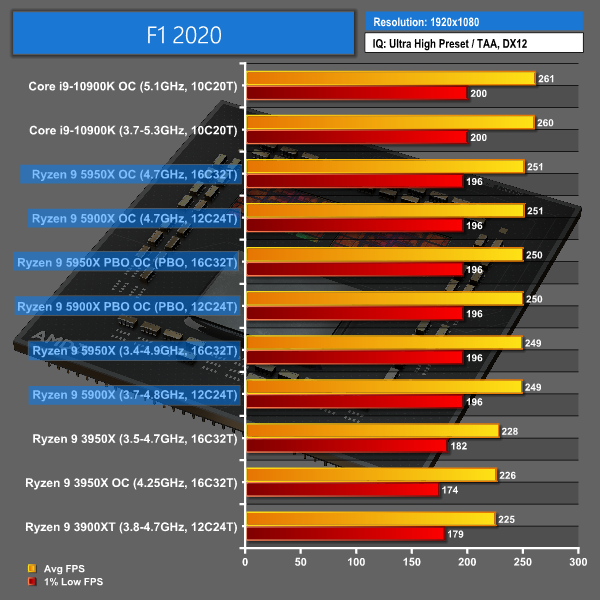 F1 2020 sees AMD making a positive start in gaming performance. At 1080p with an RTX 3080, the performance increases for Zen 3 over Zen 2 are evident, especially to high refresh rate gamers. Intel is still slightly faster at the top of the chart with the 4.9GHz+ 10900K. But AMD’s Zen 3 chips have reduced the Intel margin of victory convincingly.