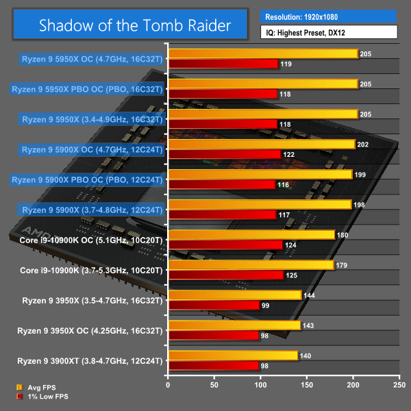 Shadow of the Tomb Raider flips AMD Zen 3 back into another chart-topping result, and this time by a notable margin. This game clearly likes the cache and latency enhancements made to Zen 3, as proven by the drastic performance uptick versus Zen 2.