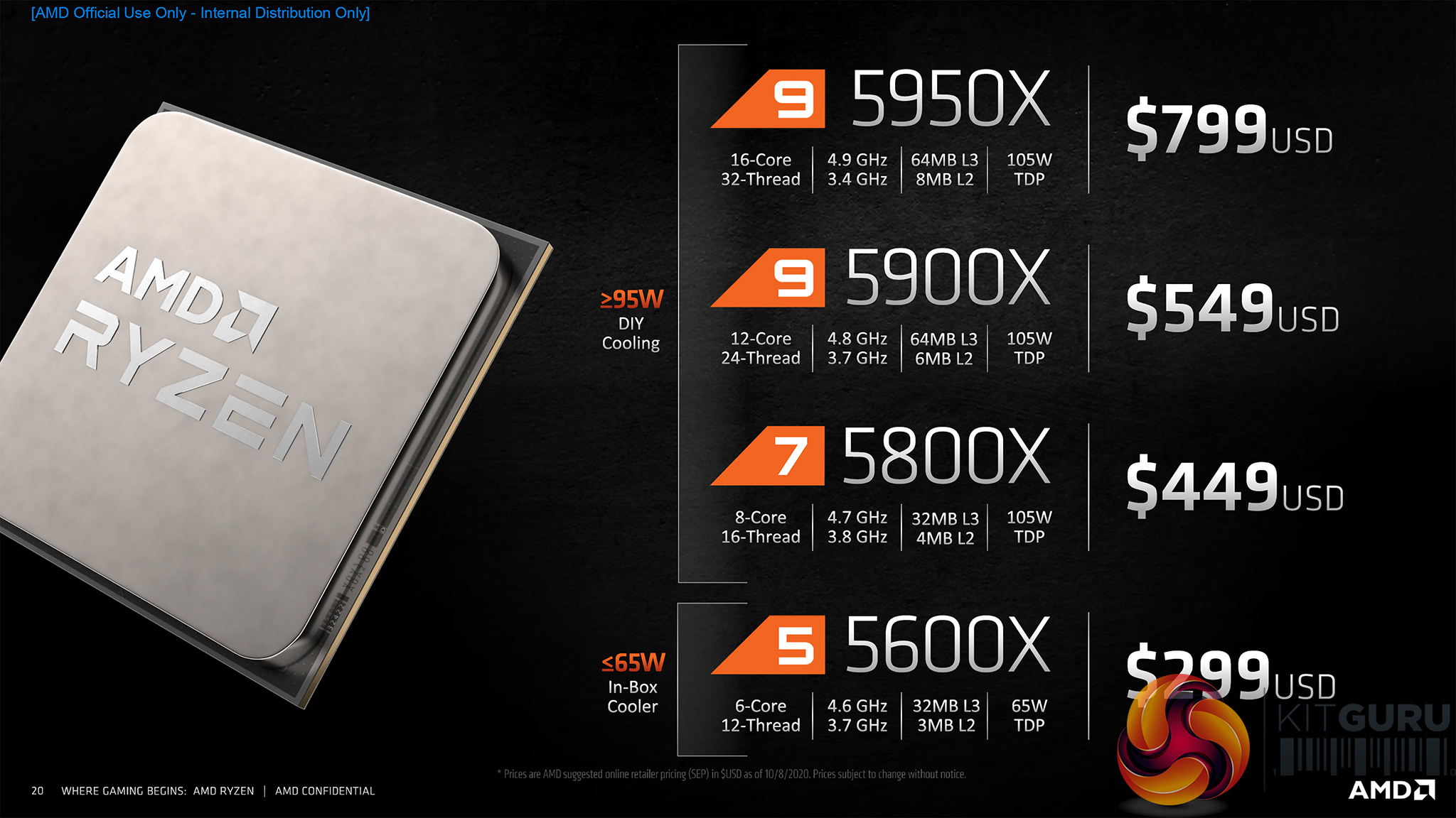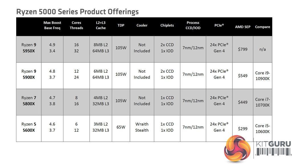 Base frequencies show no notable increase in terms of rating, though. The 5950X is actually 100MHz slower base speed than the 3950X and the 5900X sees the same deficit versus the 3900XT. AMD’s use of the same TSMC 7nm process node, but with the design tweaks implemented for the Ryzen 3000XT processors, should push actual Precision Boost frequencies well above the rated base clock.