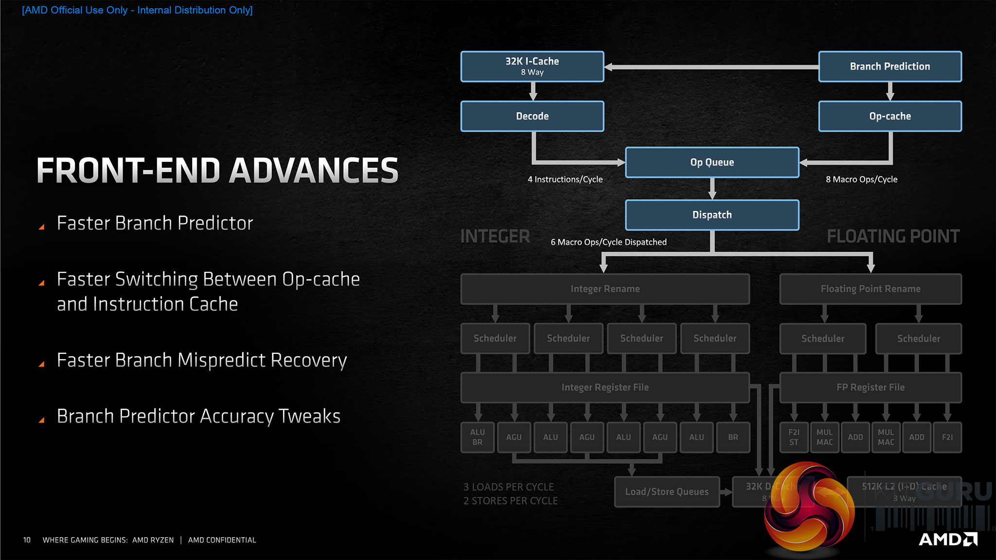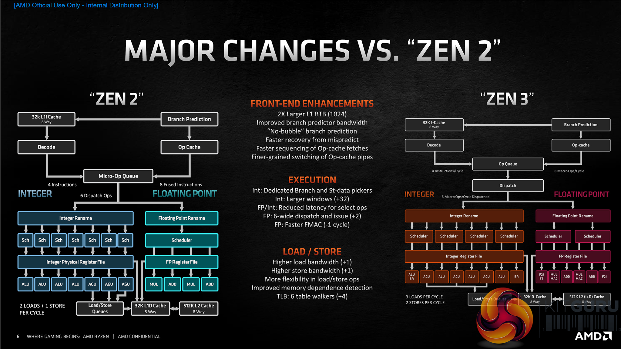 Other architectural improvements for Zen 3 include a larger L1 branch target buffer, improved branch prediction, reduced latency for select float and int operations, and higher load and store bandwidth.