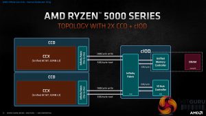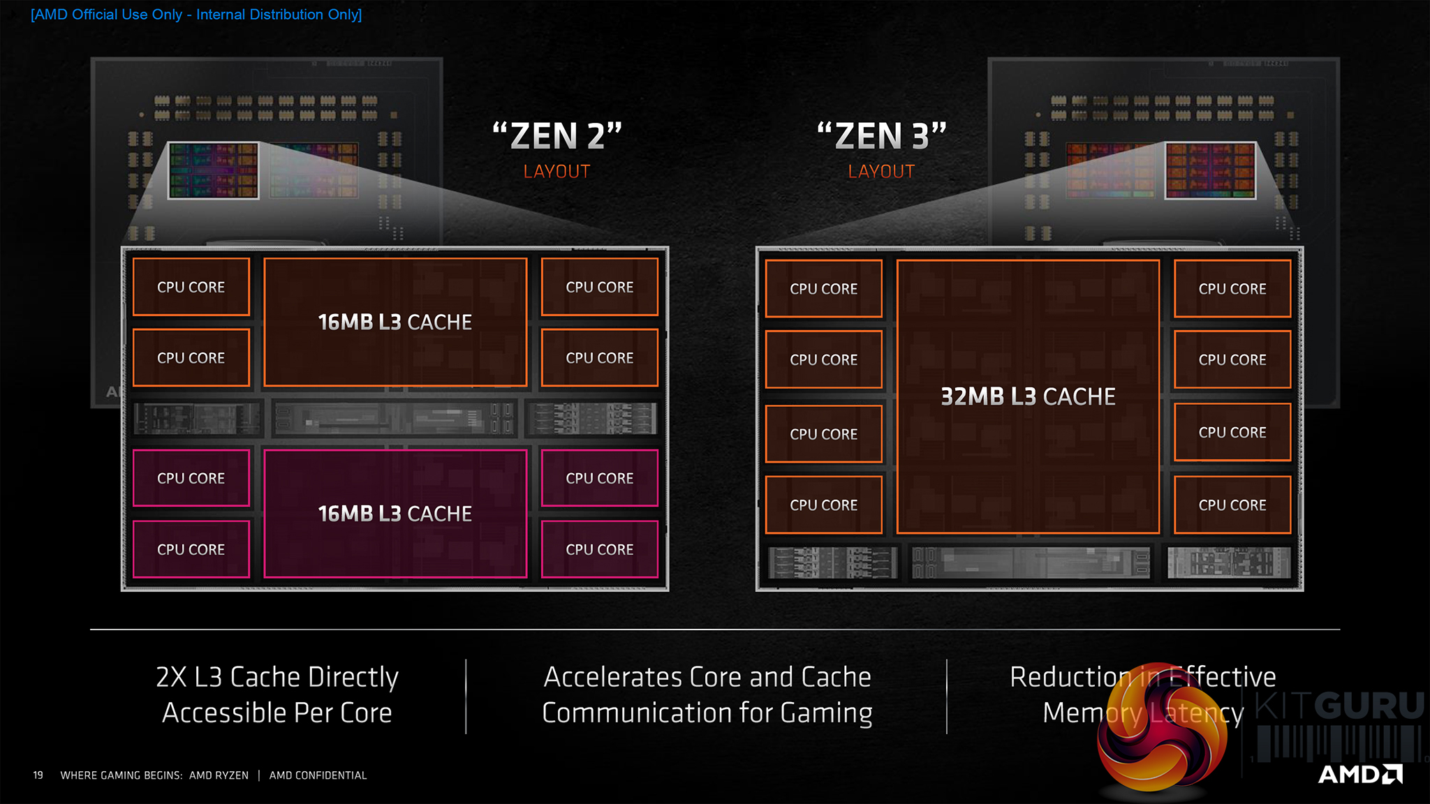 A key difference versus Zen 2 is that with Zen 3 we now get an 8-core CCX with ring architecture, rather than the 4-core CCX of Zen 2. This gives 32MB of L3 cache that is directly accessible by all eight cores on the Core Complex (CCX). Previously, the 4-core Zen 2 CCX needed a data transfer via Infinity Fabric to get to the neighbouring CCX when accessing more than 16MB of L3 cache on the CCD chiplet.