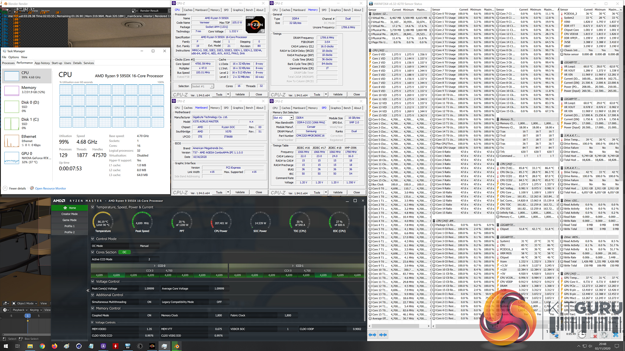 We managed to overclock the Ryzen 9 5950X CPU to 4.7GHz all-core frequency using 1.35V (around 1.32-1.33V delivered). This was tested on both the ASUS and Gigabyte motherboards with AIO and air cooling and worked very well throughout our testing. We didn’t tweak voltages down any further as the temperatures were fine for our testing.
