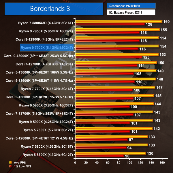 Borderlands 3 is solid on the Ryzen 9 7900X. AMD’s chip puts in a good score that is very close to the chart-topping pack.