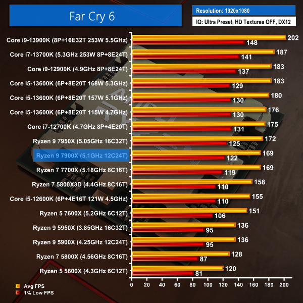 Far Cry 6 is not as strong, with the 7900X dropping down to 7700X-performance levels. In this game, the Intel 13th Gen chips are notably quicker, but it does seem that Far Cry 6 has a preference for Intel.