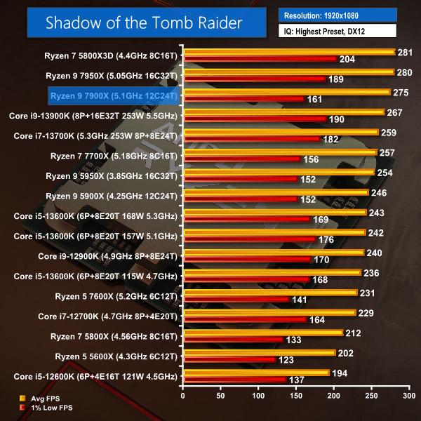 As Far Cry 6 likes Intel, Shadow of the Tomb Raider has a preference for AMD Zen. As such, the Ryzen 9 7900X is up with the chart-topping pack of AMD’s own 7950X, the 5800X3D, and Intel’s Core i9-13900K and i7-13700K.