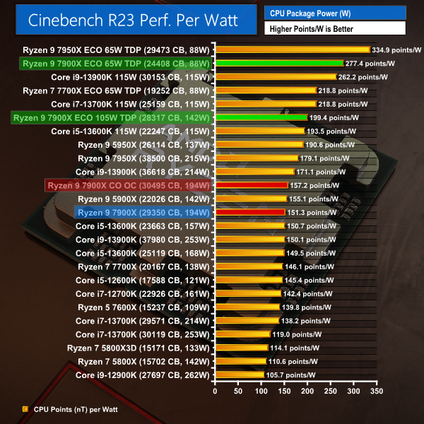 Looking at the Cinebench Performance per Watt data, Ryzen 9 7900X really shines in its Eco Mode settings. Even under its stock or Curve Optimiser overclocked modes, the 7900X does well.