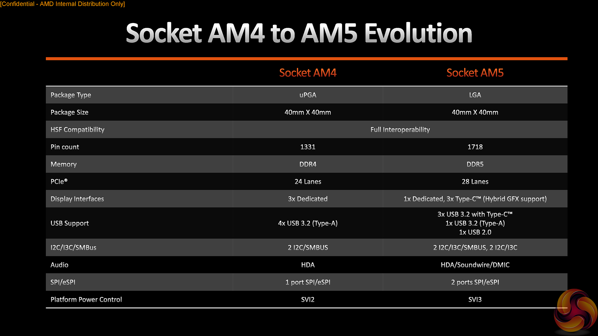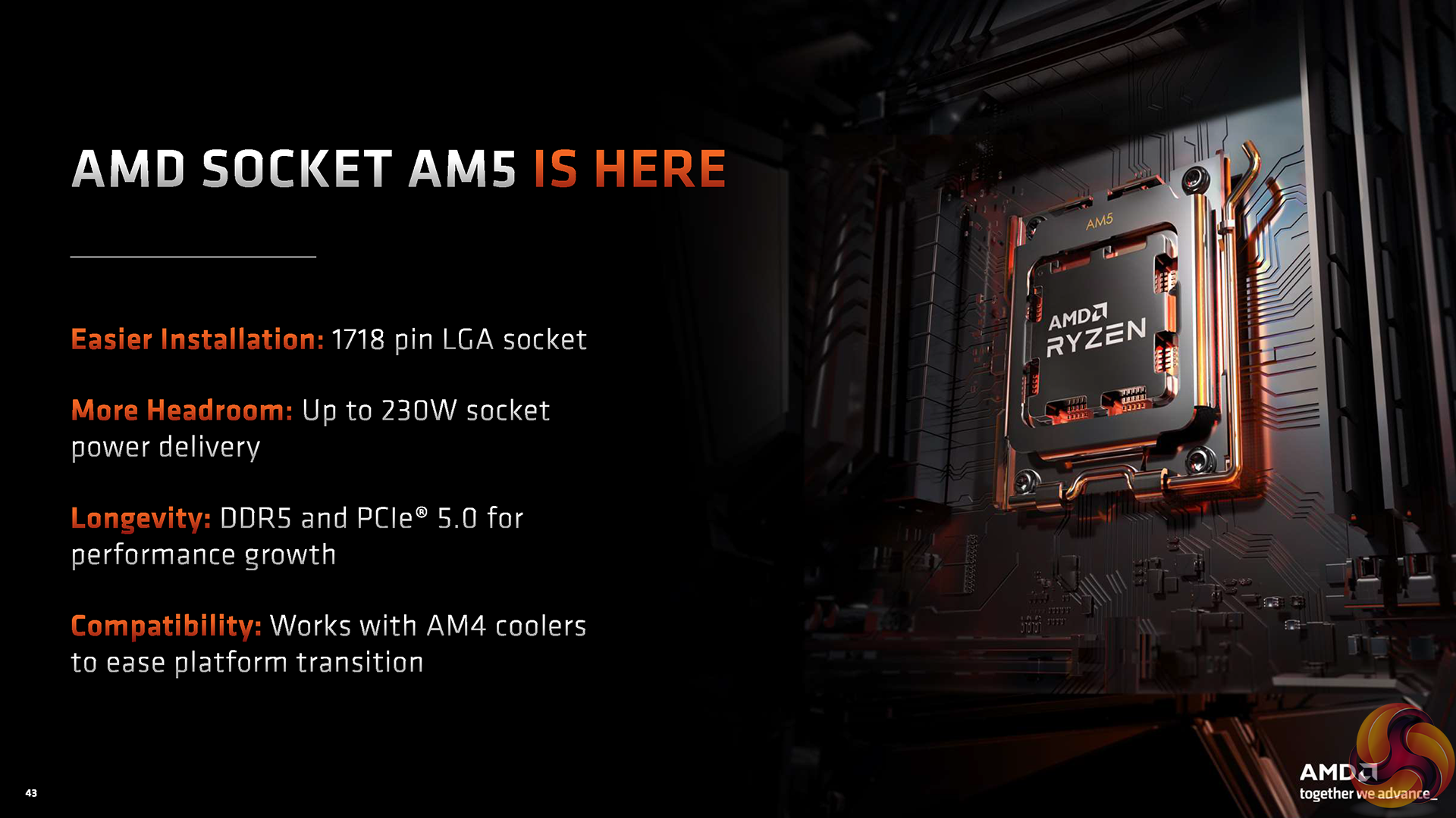 The new 1718 pin LGA AM5 socket features a denser pin array for better power capability and improved signal integrity for high-speed interfaces like DDR5 and PCIe Gen 5.