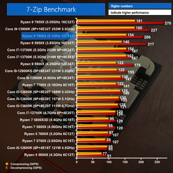 7-Zip does very well on AMD’s Zen 4 architecture, too. We see the Ryzen 9 7900X once again opening up a performance lead over the Intel Core i7-13700K.