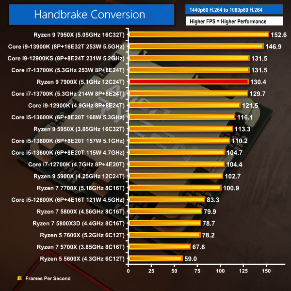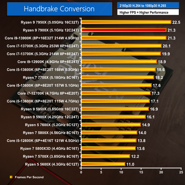 Handbrake H264 sees the stock Ryzen 9 7900X sitting just between the high-power and more sensibly-powered Core i7-13700K configurations. Once again, this isn’t a great result for AMD as the Intel chip is £90 cheaper.