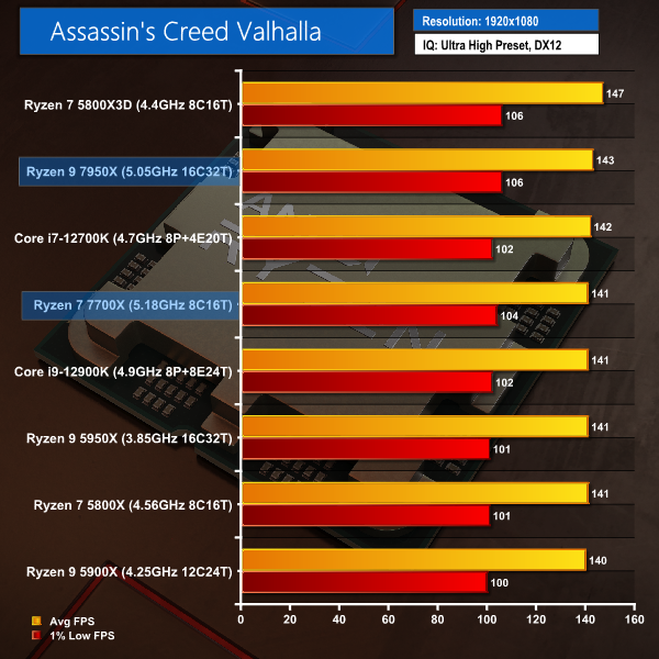 Assassin’s Creed Valhalla shows very little difference between all of these test chips when paired with a Radeon RX 6950 XT graphics card. Ryzen 7000 does will with 1% low frame rates, but there’s very little in it. Other than the Ryzen 7 5800X3D opening up a slight lead versus everything else.