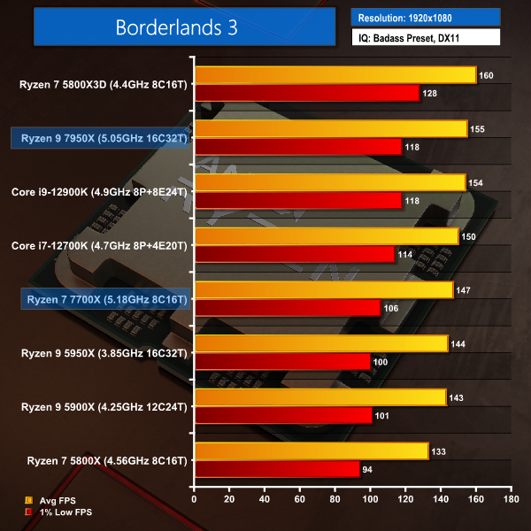 Borderlands 3 has the Ryzen 9 7950X roughly tying with the Core i9-12900K, neither of which can compete with AMD’s 3D V-Cache-equipped Ryzen 7 5800X3D. The Ryzen 7 7700X is a few frames behind the 12700K for average and 1% lows, but it does outperform the Ryzen 9 5900X by a similarly tight margin.