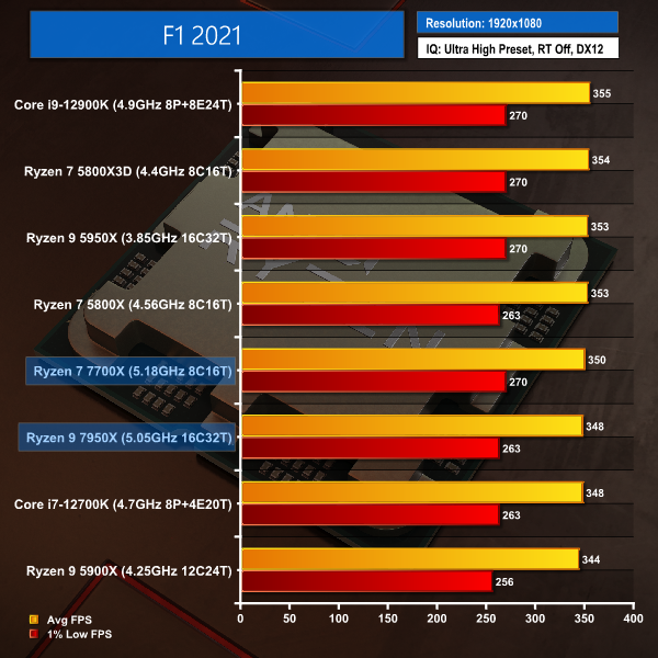 There isn’t too much to say with F1 2021; pretty much everything runs at ludicrously high average and 1% low frame rates. In fact, these numbers are all so high that there’s little value in even comparing 5-7 average FPS differences between the new Zen 4 chips and the 12900K or 5800X3D chart-toppers.