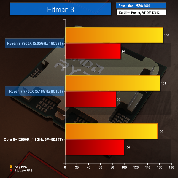 Hitman 3, switches its hierarchy at 1440p compared to 1080p. Now, the AMD Ryzen 7000 processors are tangibly quicker than the Core i9-12900K in terms of average frame rates. But the Intel processor continues to show excellent 1% low performance that beats both of the Zen 4 parts by a considerable margin.