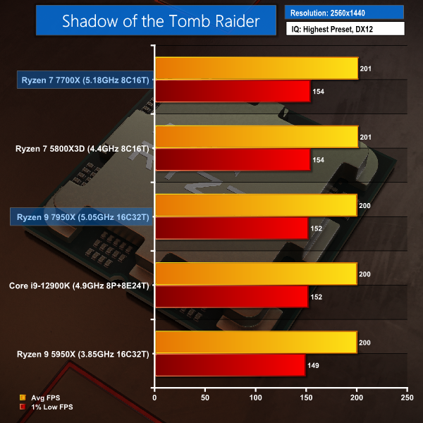 Shadow of the Tomb Raider is basically the same across the fastest cohort of gaming processors – the Ryzen 7000 chips, Ryzen 7 5800X3D, and Core i9-12900K.