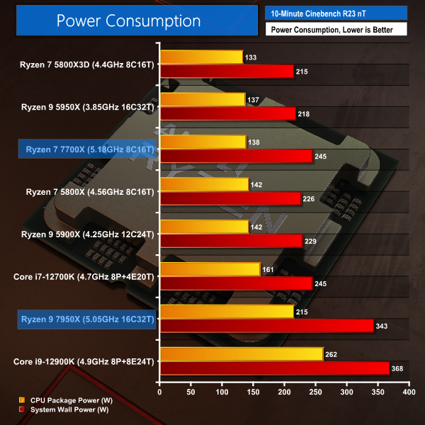 Looking at a comparison of power draw after 10-minutes of Cinebench nT loading, we can see just how thirsty the new Ryzen 9 7950X flagship is set to be.