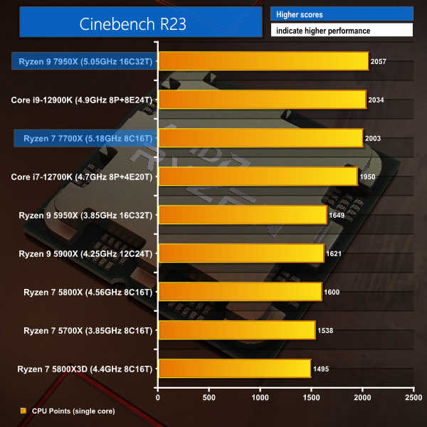 Single-thread performance is superb on the new Ryzen 7000 series chips. The flagship 7950X boosts as high as 5.7GHz and therefore delivers chart-topping performance that is above the speedy Core i9-12900K. And the 5.55GHz peak of AMD’s Ryzen 7 7700X in our testing positions it at third place in our chart – beating its Core i7-12700K competitor and smashing the Ryzen 9 5900X.