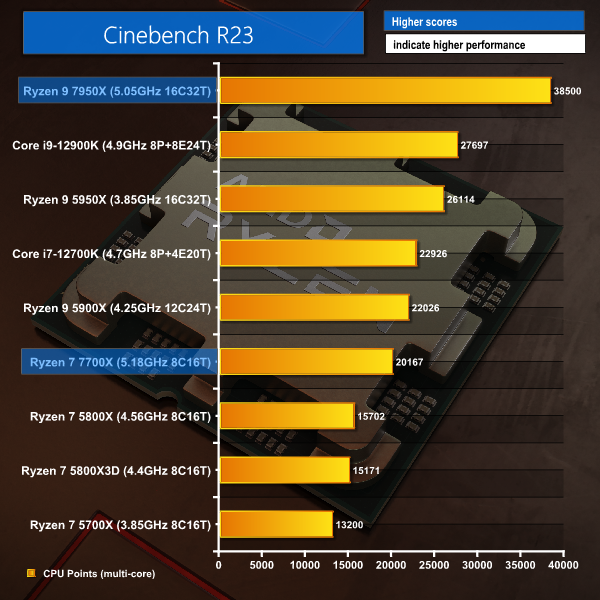 Cinebench R23 nT shows much of the same trend as Blender. The new Ryzen 9 7590X is an absolute performance monster thanks to its 32 threads pumping away at lofty clock speeds.