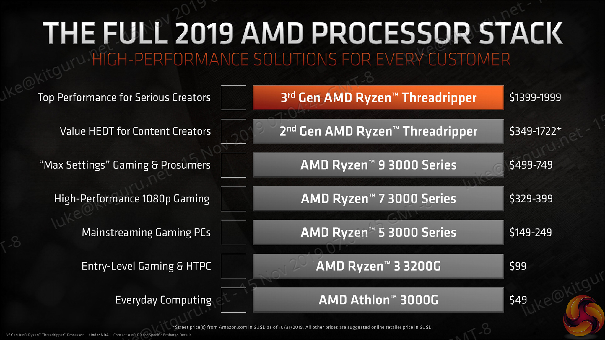 The $1999 3970X will ship in 32-core, 64-thread form via its 8 CCX and 4 CCD design. The lower cost 3960X is priced at $1399 and its 24 cores are built on the same four CCD design but with two cores per CCD disabled. The pricing for Threadripper clearly spells a hefty price premium for these parts versus AM4 Ryzen 3000. However, these are now the highest core count prosumer/non-server CPUs on the market (excluding AMD's old Zen+ products) … until the 64-core Threadripper 3990X in 2020 – yes, it has been confirmed!