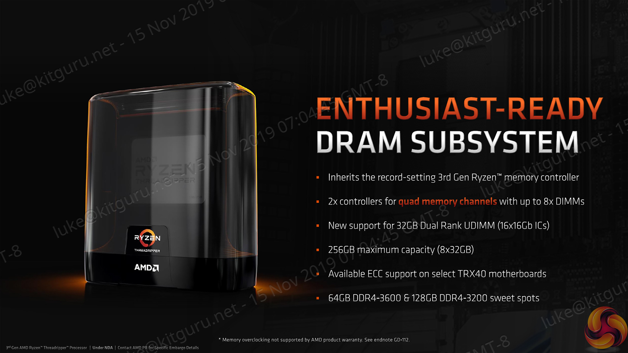 Support for quad-channel memory with up to 256GB capacity is provided due to the 32GB capacity limitation of currently available DIMMs in an eight-slot board. ECC support is available, but this is down to the motherboard vendor to implement. In terms of frequency, the situation is slightly complex. Fundamentally, memory support is the same as with Ryzen 3000 as this is still using the Zen 2 memory controller. However, there are more DIMMs to power and manage for Threadripper’s quad-channel configuration.