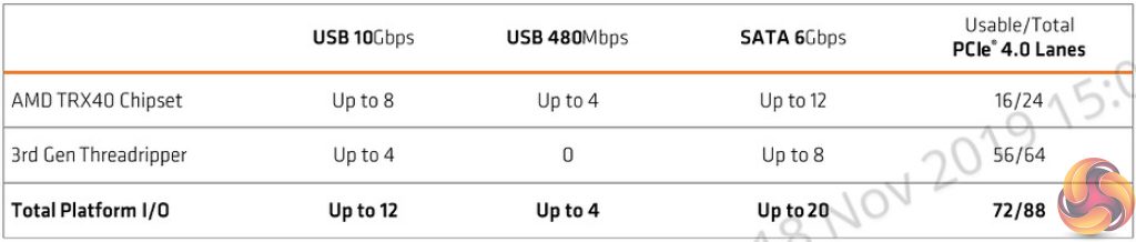 That leaves 56 lanes on the CPU but ‘only’ 48 of these are usable to the expansion slots or other devices. Instead, 8 PCIe 4.0 lanes are used to connect the Ryzen Threadripper processor with the TRX40 chipset.