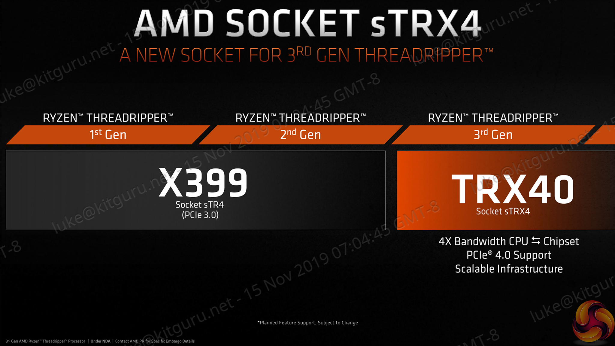 Due to improved connectivity between the CPU and chipset, in addition to the ‘future scalability’ of the TRX40 platform, Ryzen Threadripper 3000 sTRX4 socket CPUs are not backwards compatible with the socket TR4/X399 platform and vice versa. This is annoying to users who have invested heavily in their X399 motherboard or those who were hoping to jump on a cheap Threadripper 2920X before upgrading to the new 24-core or 32-core (or 64-core) model in the future.