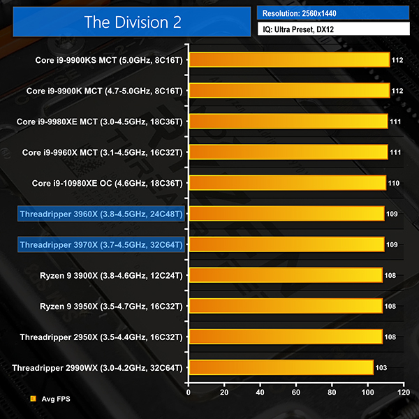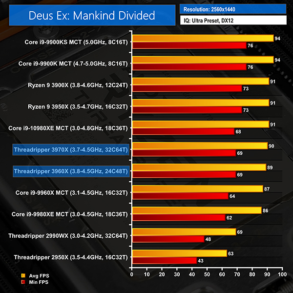 We supplement the 1080p gaming results with three games tested at 2560×1440 resolution. We chose Deus Ex: Mankind Divided, Far Cry 5, and The Division 2. Deus Ex and The Division 2 are particularly GPU heavy at higher resolutions and Far Cry 5 is a (relatively) computationally-heavy, open-world game.