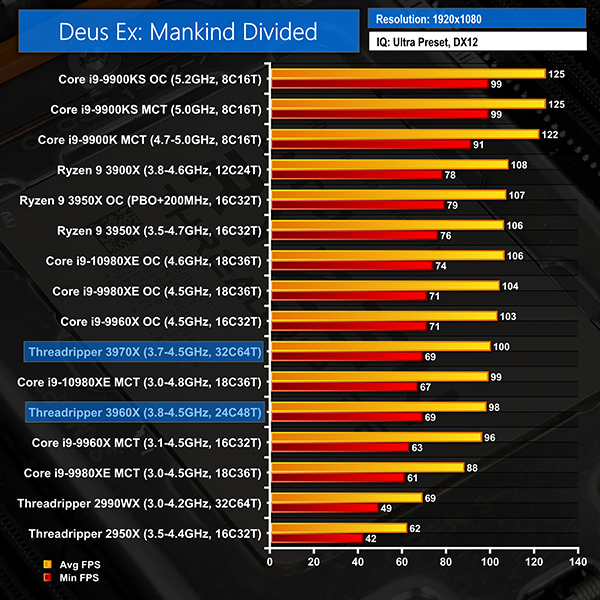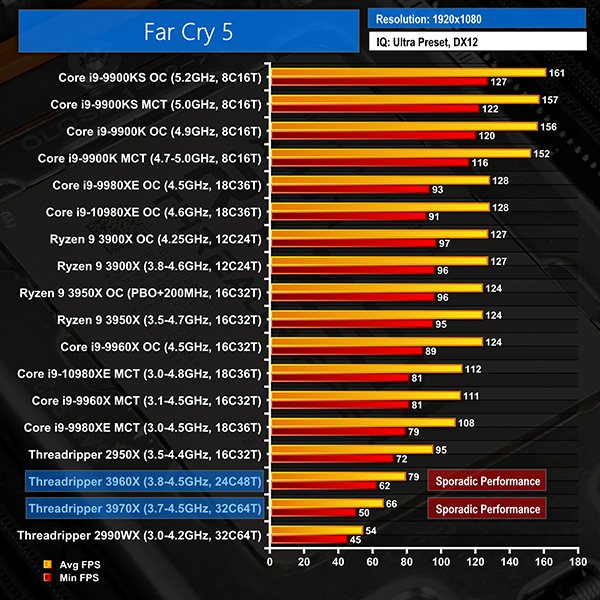 The Far Cry 5 result was lower than one would expect, with this title showing particularly sporadic performance from boot to boot. An easy way to fix this is to apply Game Mode within Ryzen Master, reboot the system as required, and drop down to 8-core, 16-thread operation. This boosted our Far Cry 5 FPS numbers on the 3970X to 113 average at 1080P.