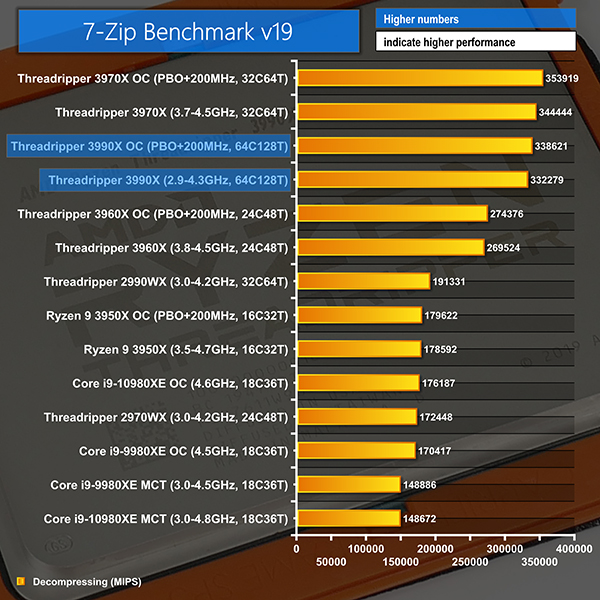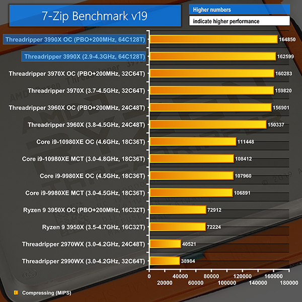 7-Zip does not make use of more than 64-threads and therefore offers no meaningful performance improvement versus the 3970X. The abilities of Precision Boost 2 mean that the 3990X increases its multi-threaded clock speed accordingly when only 64-threads are loaded, thus allowing it to run at frequencies comparable to the 32-core Threadripper.