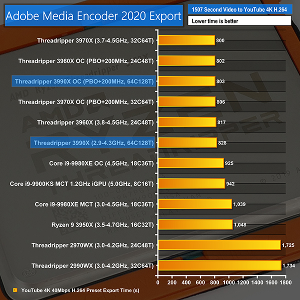 The key point to take from our result is that budding YouTubers or video editors shooting in 4K and dealing with H.264 exports need not run out and buy a 3990X; the 3960X is a smart choice for such workloads.