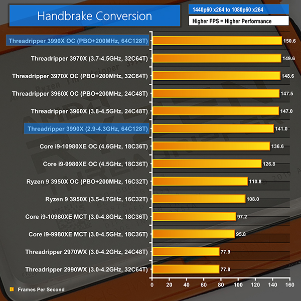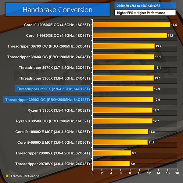 Clearly, Handbrake offers up no tangible performance gains for the 3990X as it cannot address more than 64 threads. If you simply run Handbrake and step away from your system, there is no benefit from the 64-core chip. But if you convert your high-res video footage in Handbrake, whilst also exporting media from Adobe Premiere, whilst also packaging up the raw A-Roll footage using 7-Zip, maybe then the 3990X and its heavy multi-tasking capabilities will come into play.