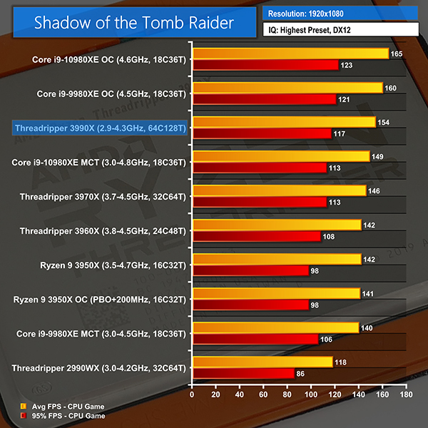 With that said, Shadow of the Tomb Raider ran perfectly well without needing to use the core-disabling game mode. In fact, the 3990X was slightly faster than the 3970X on average and this follows a similar trend of this game’s preference for higher core count chips, even if they are clearly not 100% utilised.