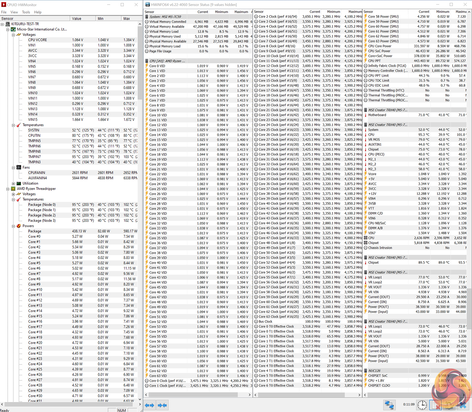 Software-reported CPU package power was in the order of 500W for these readings. However, extended stress tests running towards the 1-hour mark saw the delivered package power drop to around 400-450W in order to stick to the 95°C target.