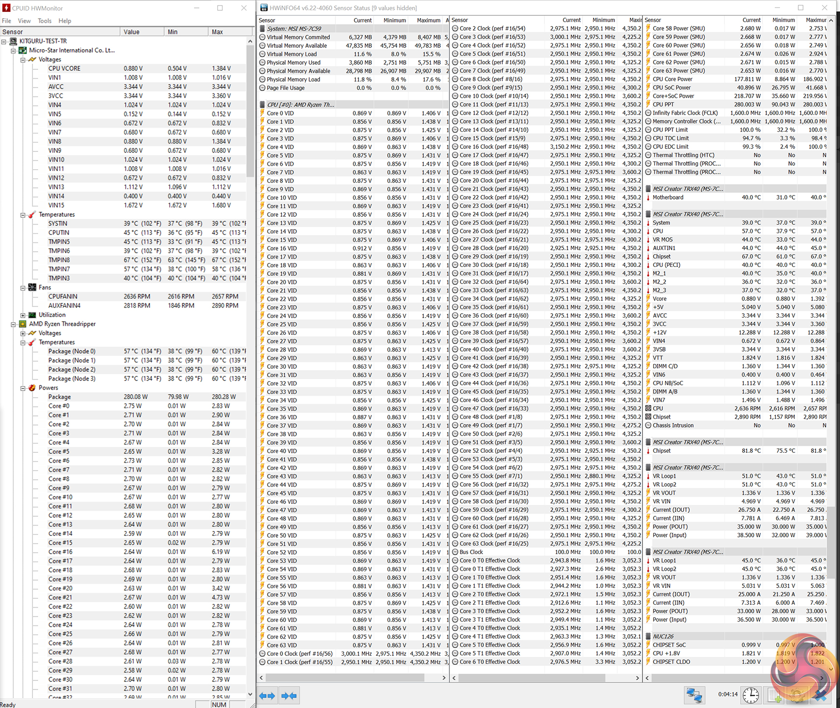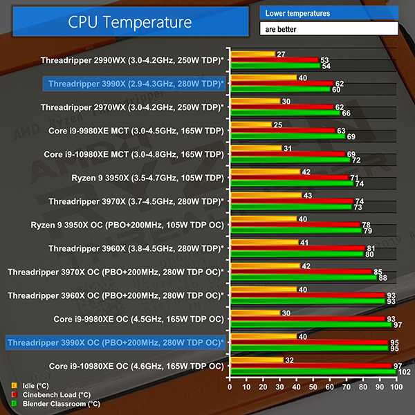 Using the Cooler Master Wraith Ripper, recorded temperatures were very low at just over 60°C. This is because the temperature profile of AMD’s Zen 2 processors is frequency-biased and the lower frequency of the 3990X allows it to operate at a lower core voltage and therefore lower temperatures. That’s a lot of ‘lowers’.