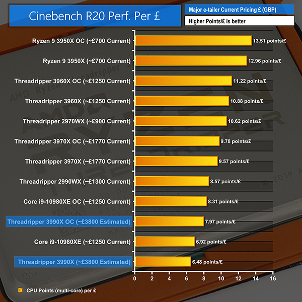 The price premium commanded by a flagship product rarely paints a positive picture in our performance per pound chart. That trend continues for the 3990X, which comes in 100% more expensive than the 3970X but does not deliver 100% more performance.