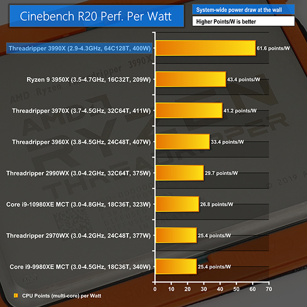 Huge multi-threaded resources and a power efficient, yet reasonable, operating frequency are ingredients for success in our Cinebench performance per Watt metric. The 64-core 3990X delivers, beating out the 32-core 3970X by around 50%.