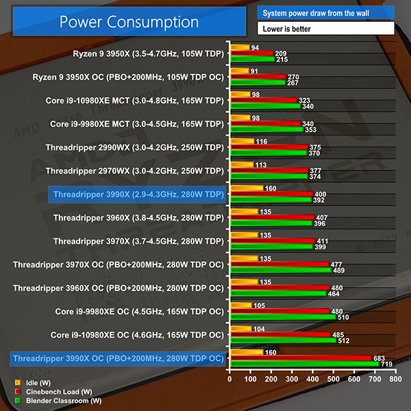 Unsurprisingly, the 280W TDP 3990X demands the same amount of power as the other 280W TDP Threadripper chips – around 400W under heavy all-core load. The differences between our Threadripper 3960X or 3970X and 3990X idle readings pertain to variations between the test motherboards in each case.