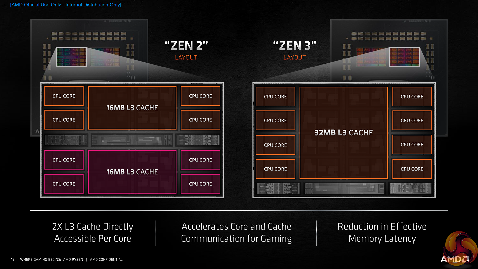 Of course, total cache on the chips is just as reported. But one of the key improvements for the Zen 3 CCX versus Zen 2 was a unified 32MB of L3 cache surrounded by eight cores. That means that the Zen 3 cores get better local access to double the amount of L3 cache, as compared with Zen 2 and its 4-core, 16MB L3 CCXs. There should be less inter-CCX latency for certain cache-sensitive workloads.