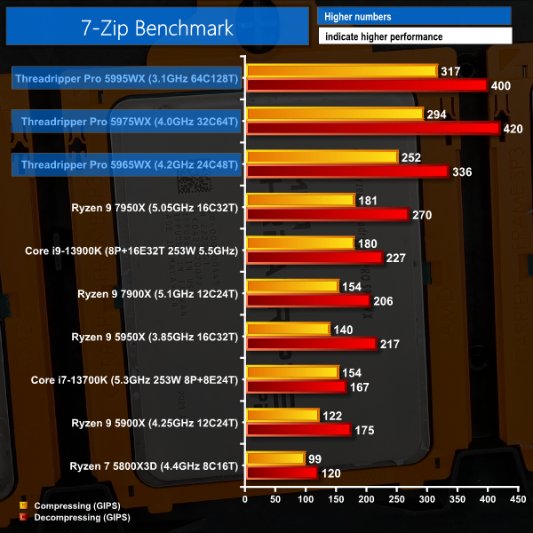 The performance improvement from the 16-core Zen 4 Ryzen 9 7950X to the 24-core Zen 3 Threadripper Pro 5965WX emphasises my previous point about the platform-wide scenarios whereby workstation-grade hardware can show value.
