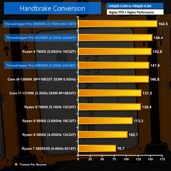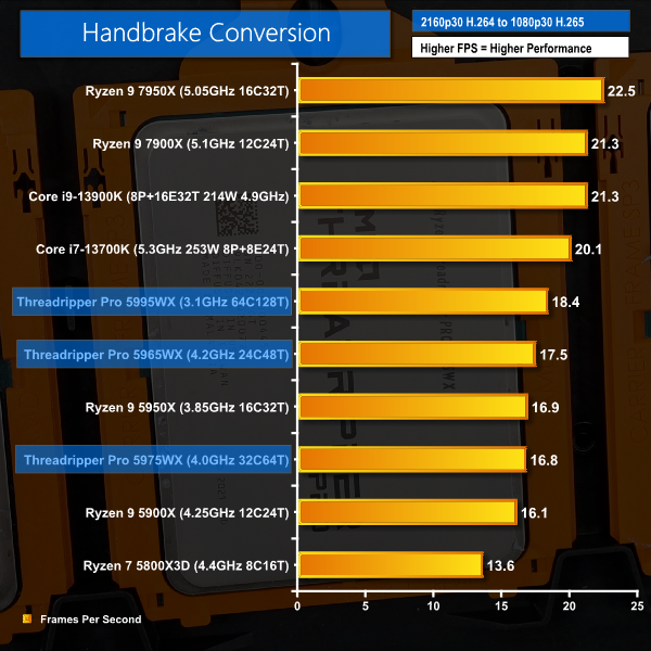 Handbrake H264 performance is strong from Threadripper Pro, given the high core counts.