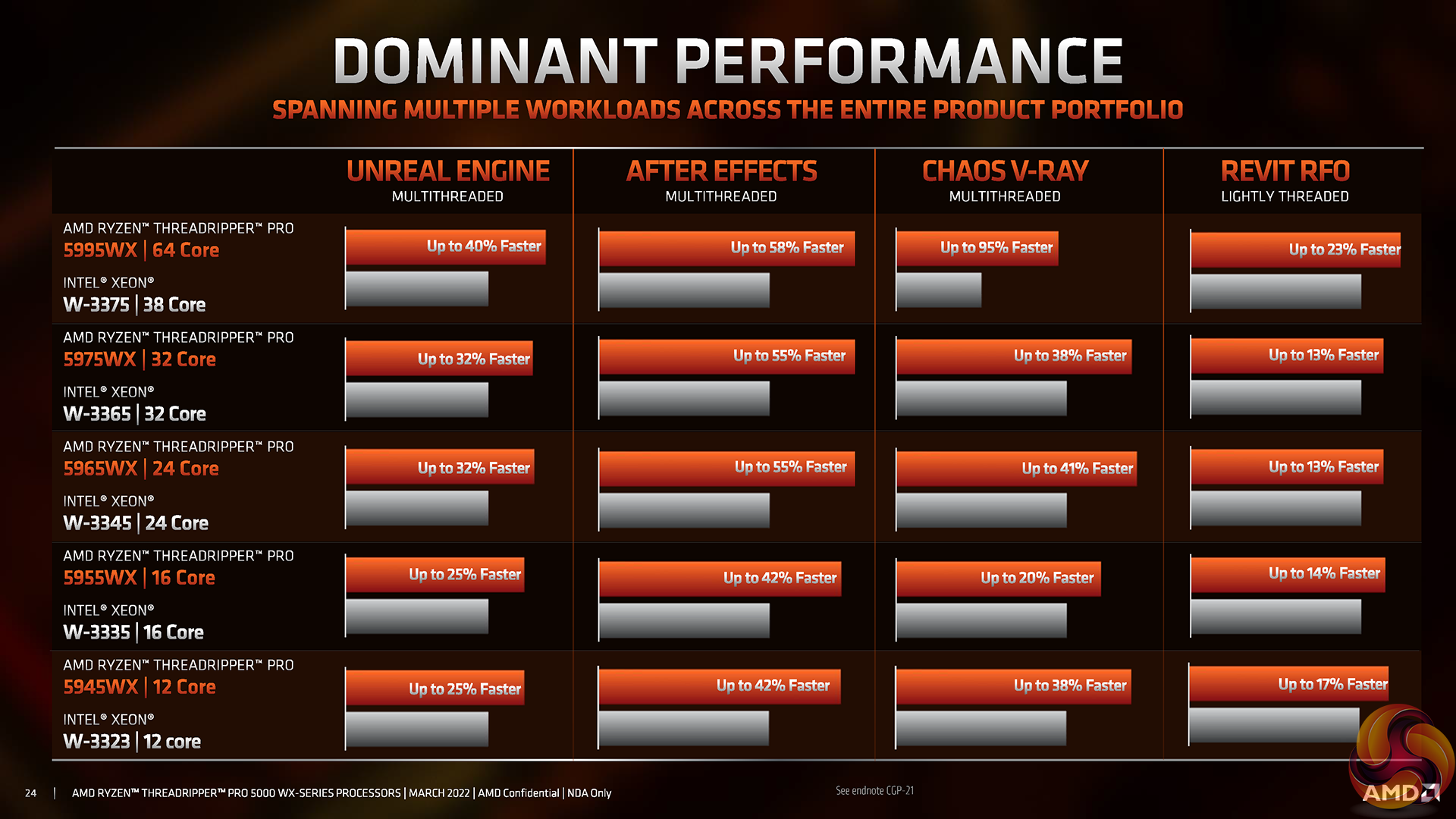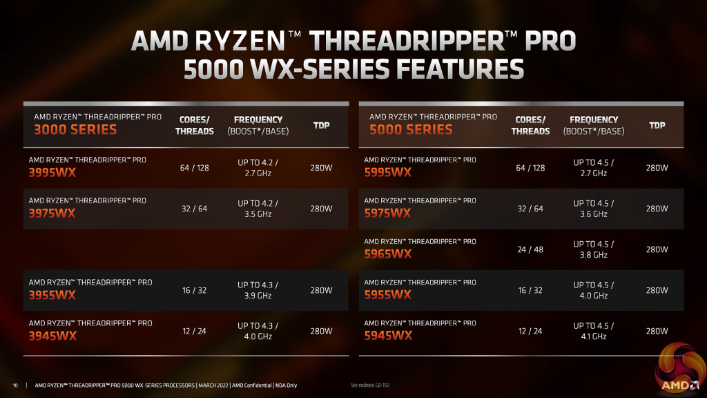 One key difference, however, is the inclusion of the new 24-core 5965WX SKU. This seems like an incredibly smart move; the gap between the competitive 32-core and the far less desirable 16-core offerings was significant for the 3000WX-series. Now, that 48-thread part can plug the gap nicely, particularly with its very healthy 3.8GHz base clock.